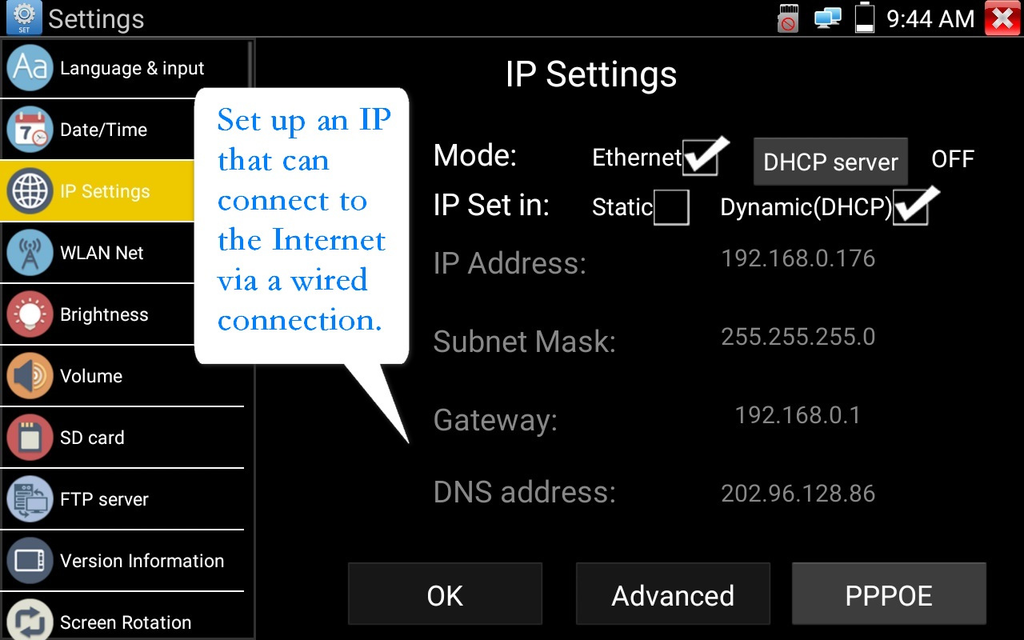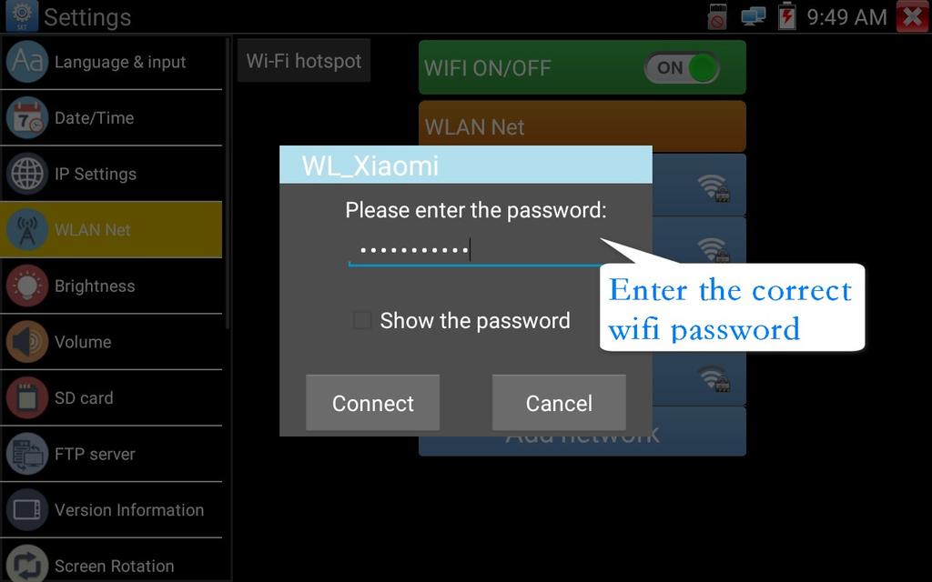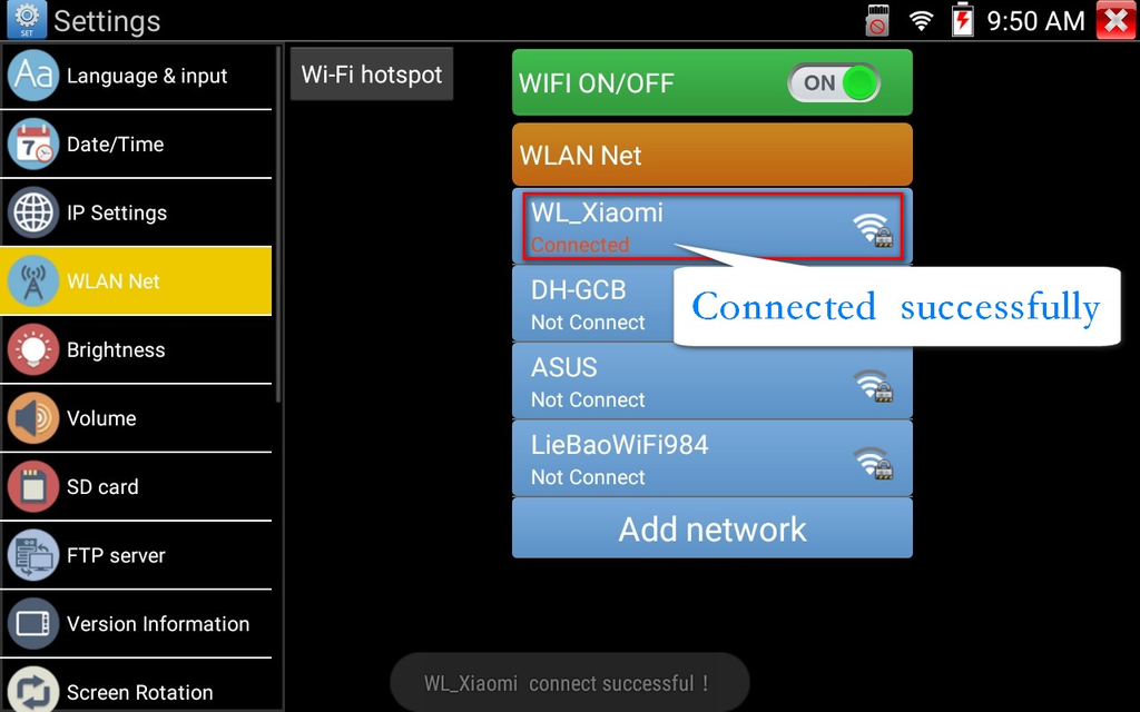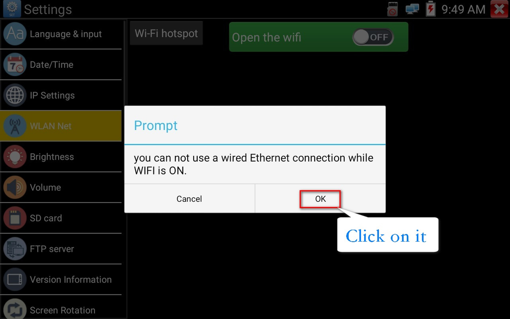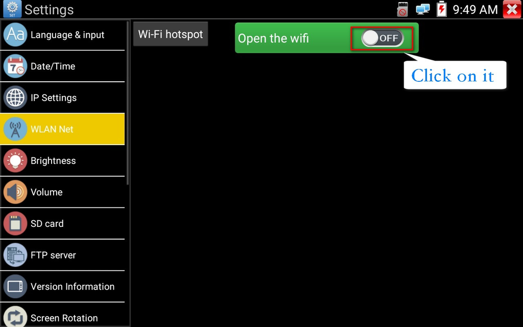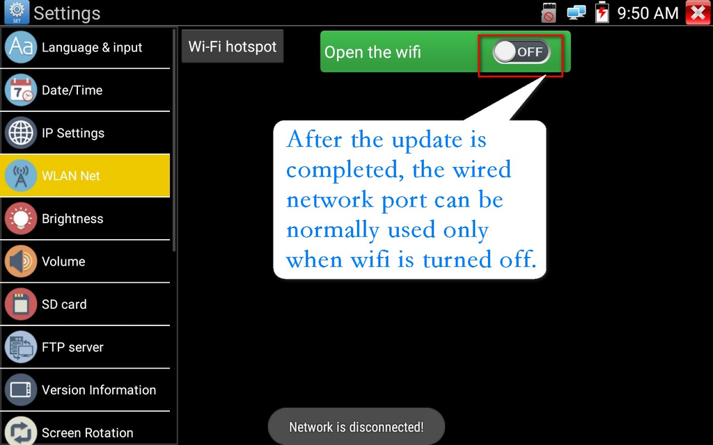 If you are accessing the Internet wirelessly via WiFi, you need to turn on WiFi.The WiFi of the tester and the wired network port cannot be used at the same time. After the WiFi is updated, the WiFi shall be turned off before the wired network port can be used normally.See the figure below for the operation: