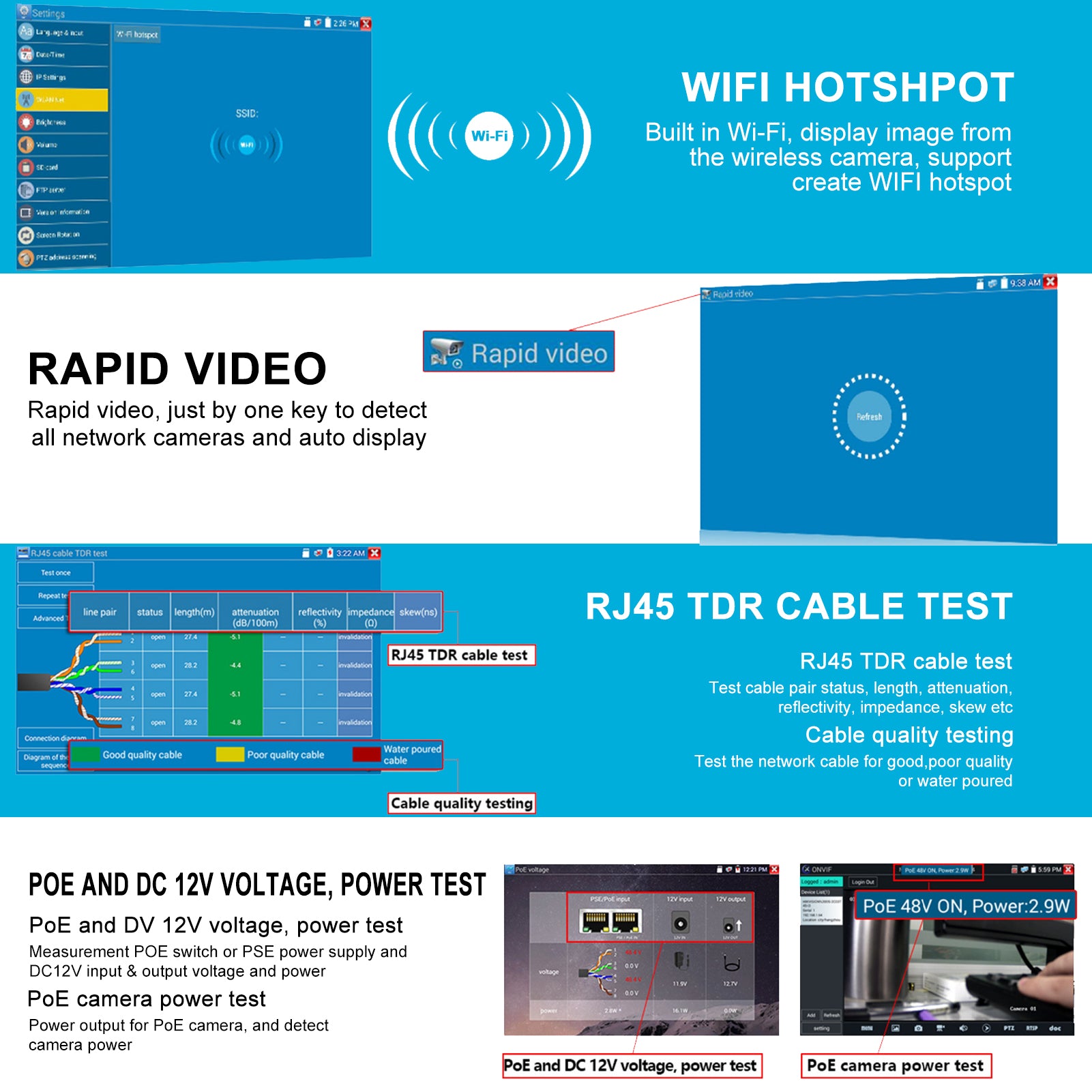 Although it is an entry-level tester of the IPC-9800 Plus+ series, but In the context of the increasing popularity of IP camera, it came into being. It can support the testing of 12MP IP camera and CVBS cameras. It is the best choice when you only need to test the network camera. Professional test app, POE, cable test, WiFi, power output, HDMI output, RS485 are all available. Using Android system, you can automatically update APP after connecting to the Internet. But if you need to test HD CVI TVI AHD CVBS cameras, please purchase other Higher level tester, it does not support testing these types of cameras.You can continue to view the details to learn more. If you need any help, you can contact us at SALES@RSRTENG.COM![]()