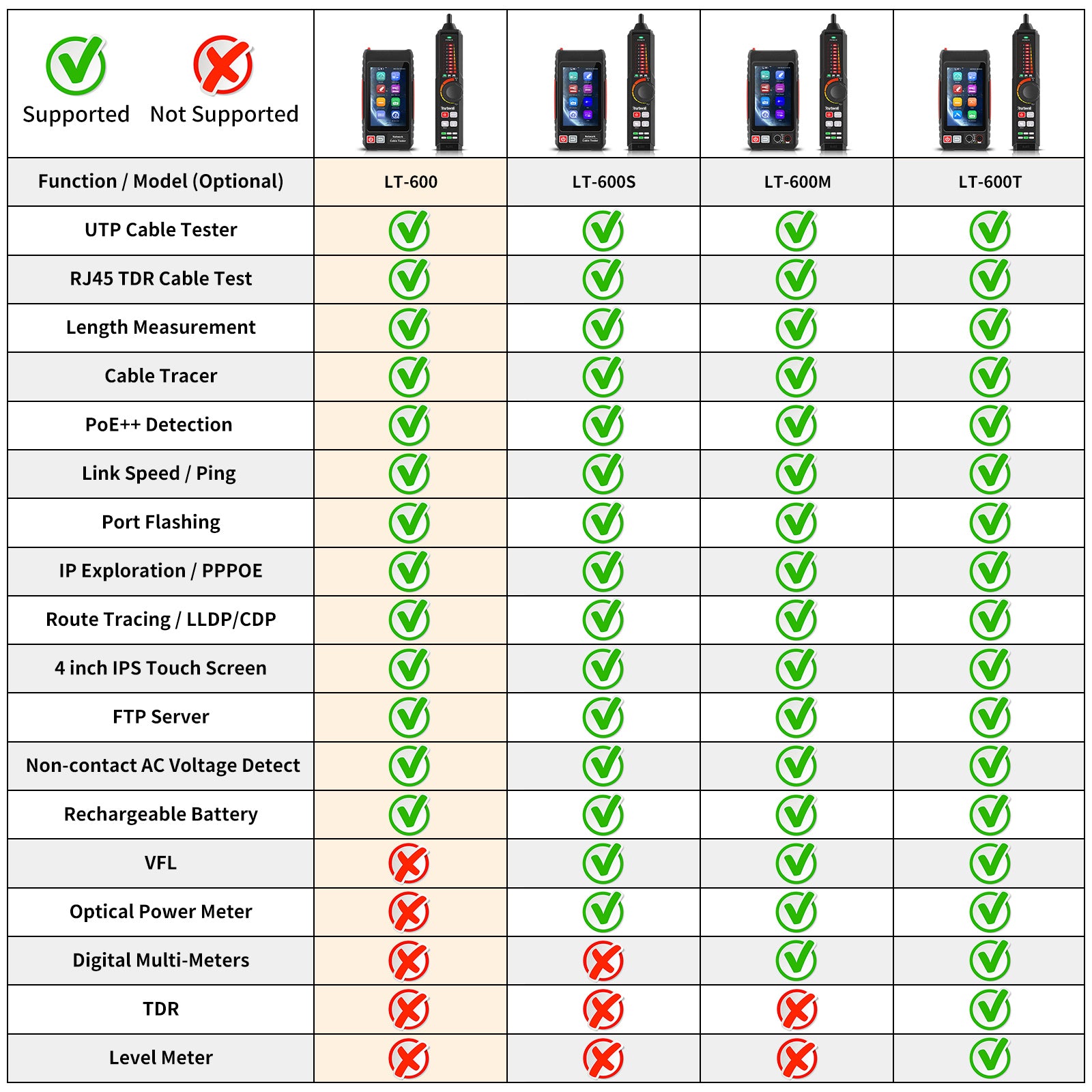 Note: This model does not support Optical power meter(OPM), Visual fault locator(VFL), Digital multimeter(DMM), TDR and Level testing.