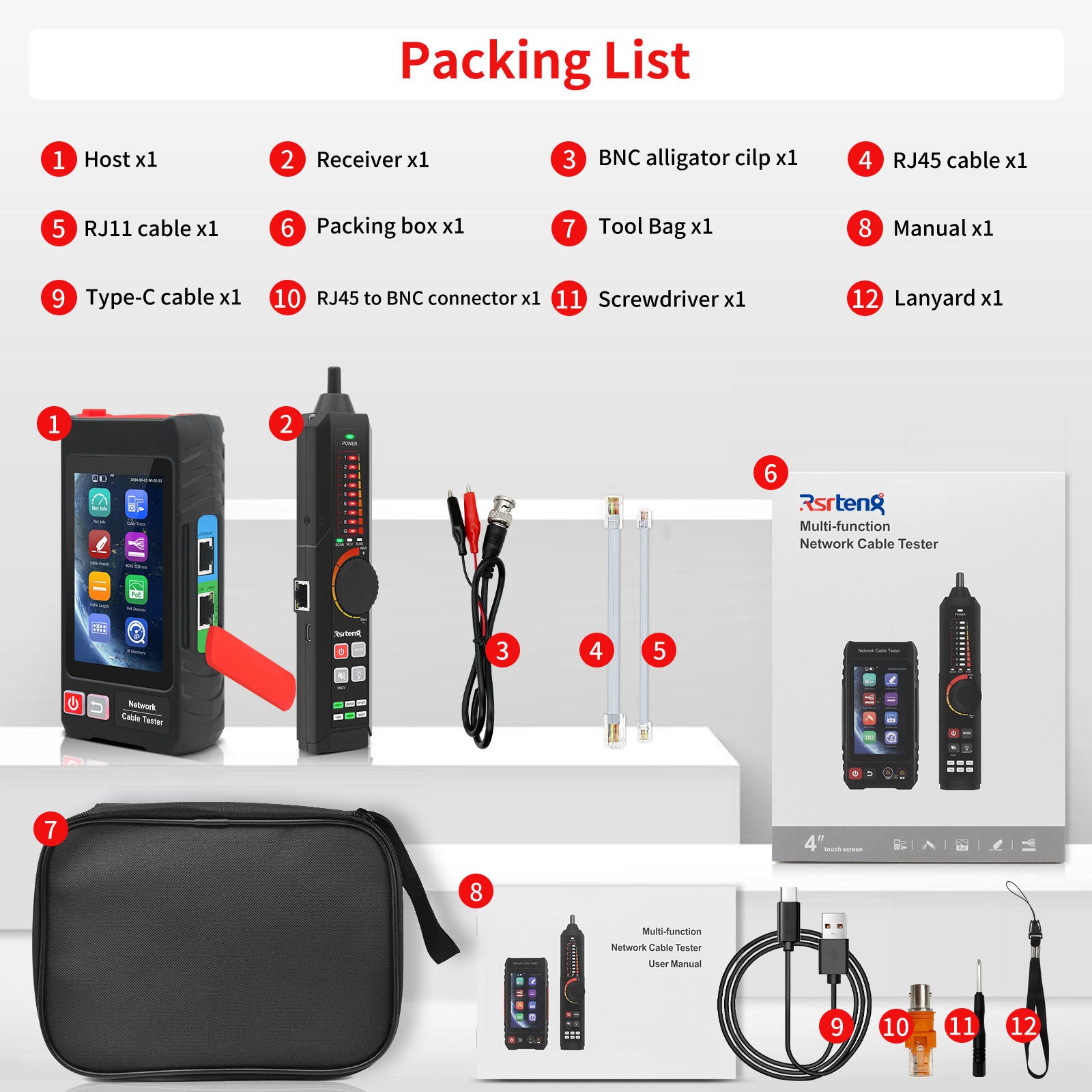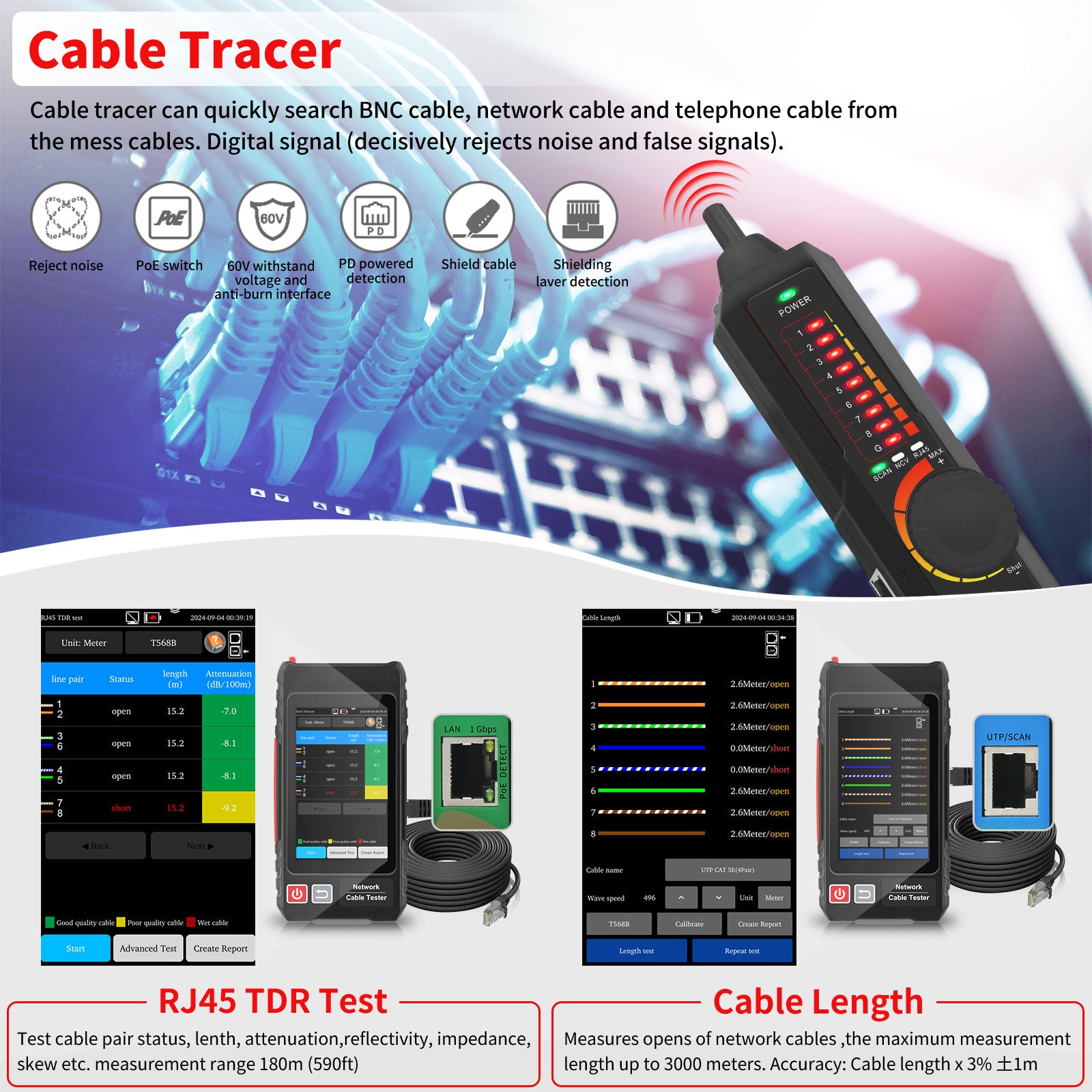 | Length Measurement | Measure opens of network cables, max measurement length up to 3000 meters. Accuracy: Cable length x 3% ± 1m |