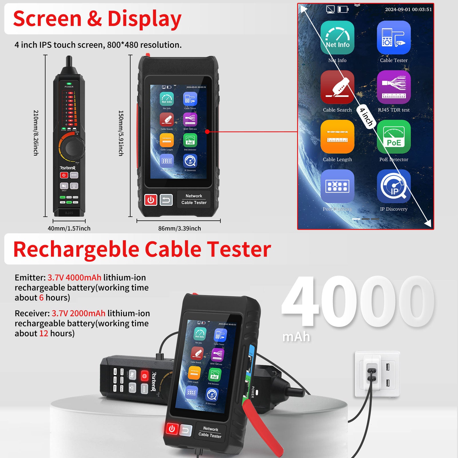l Main unit and cable tracer. 4-inch color IPS touch screen, 800*480 resolution. Both the main unit and the cable tracer have built-in lithium batteries.