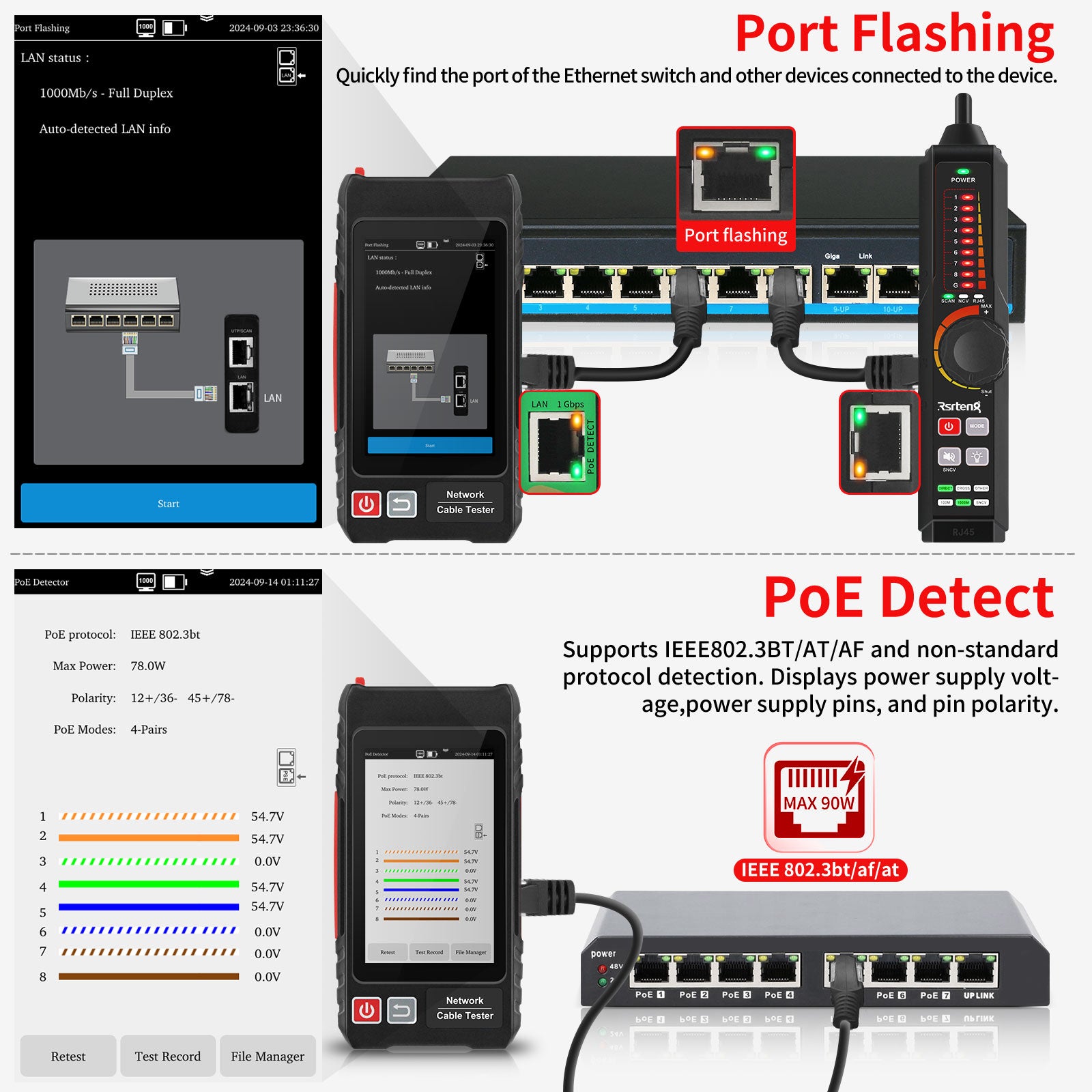 Additionally, it supports PING testing, IP address scanning, Port flash, standard and non-standard PoE equipment detection, PoE power online test.
