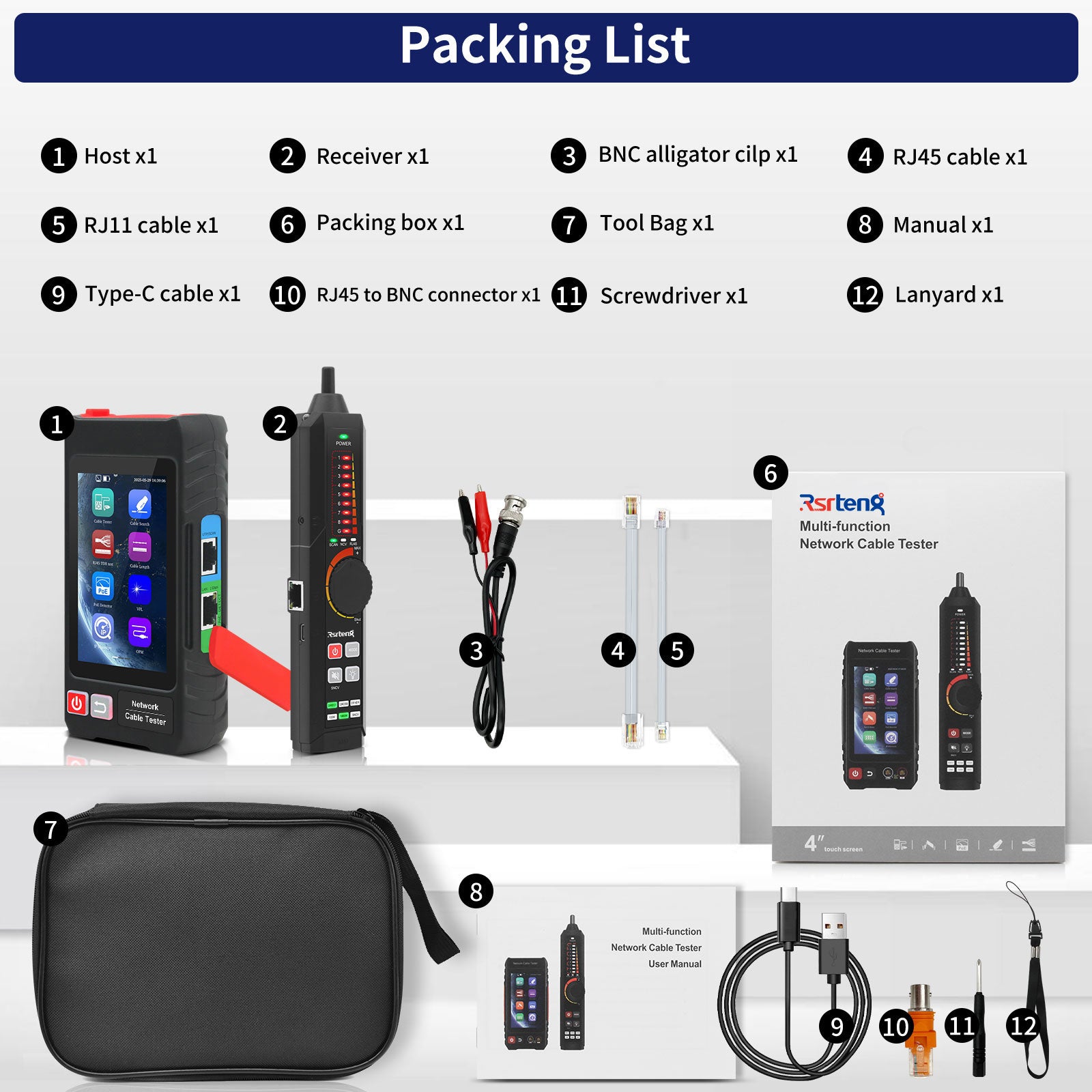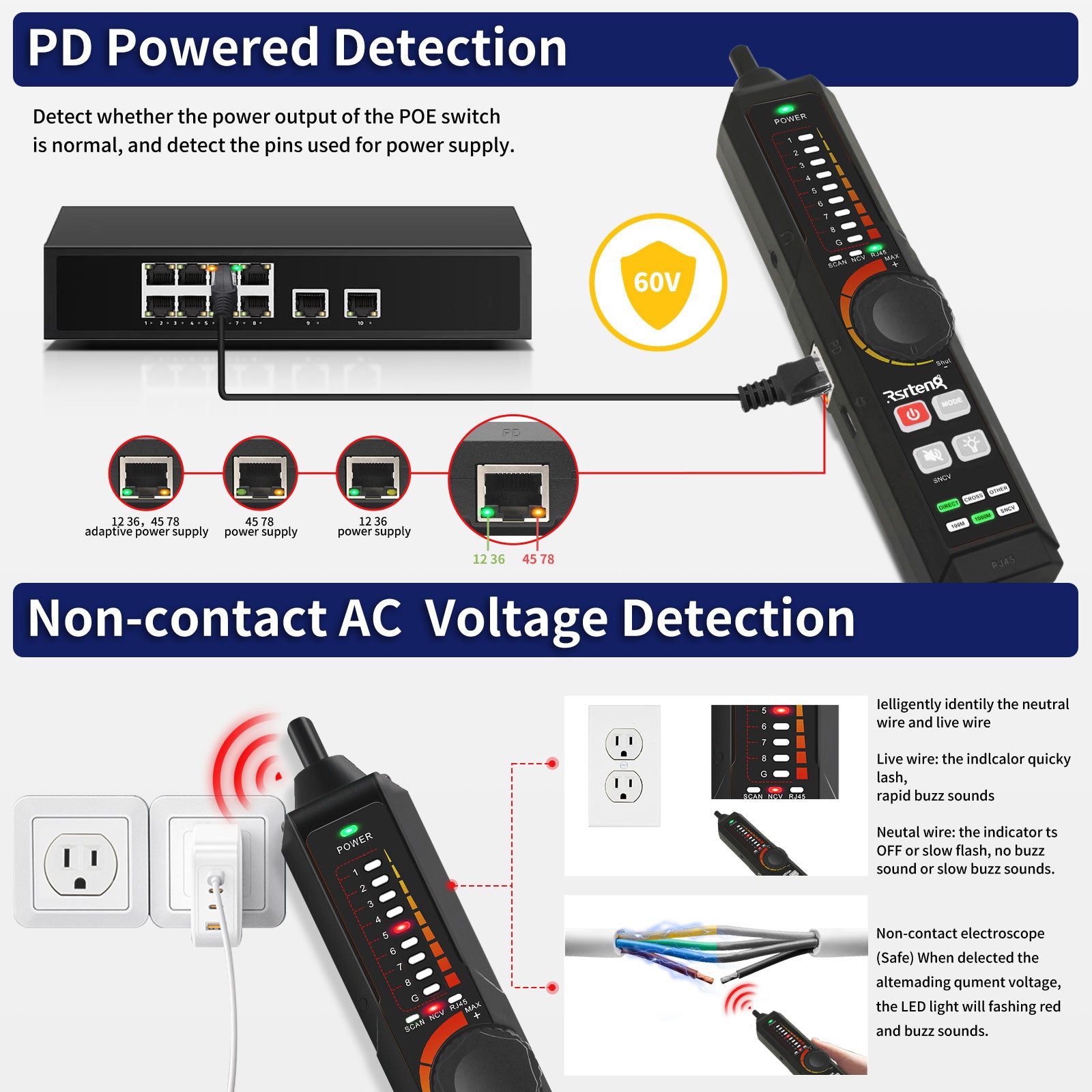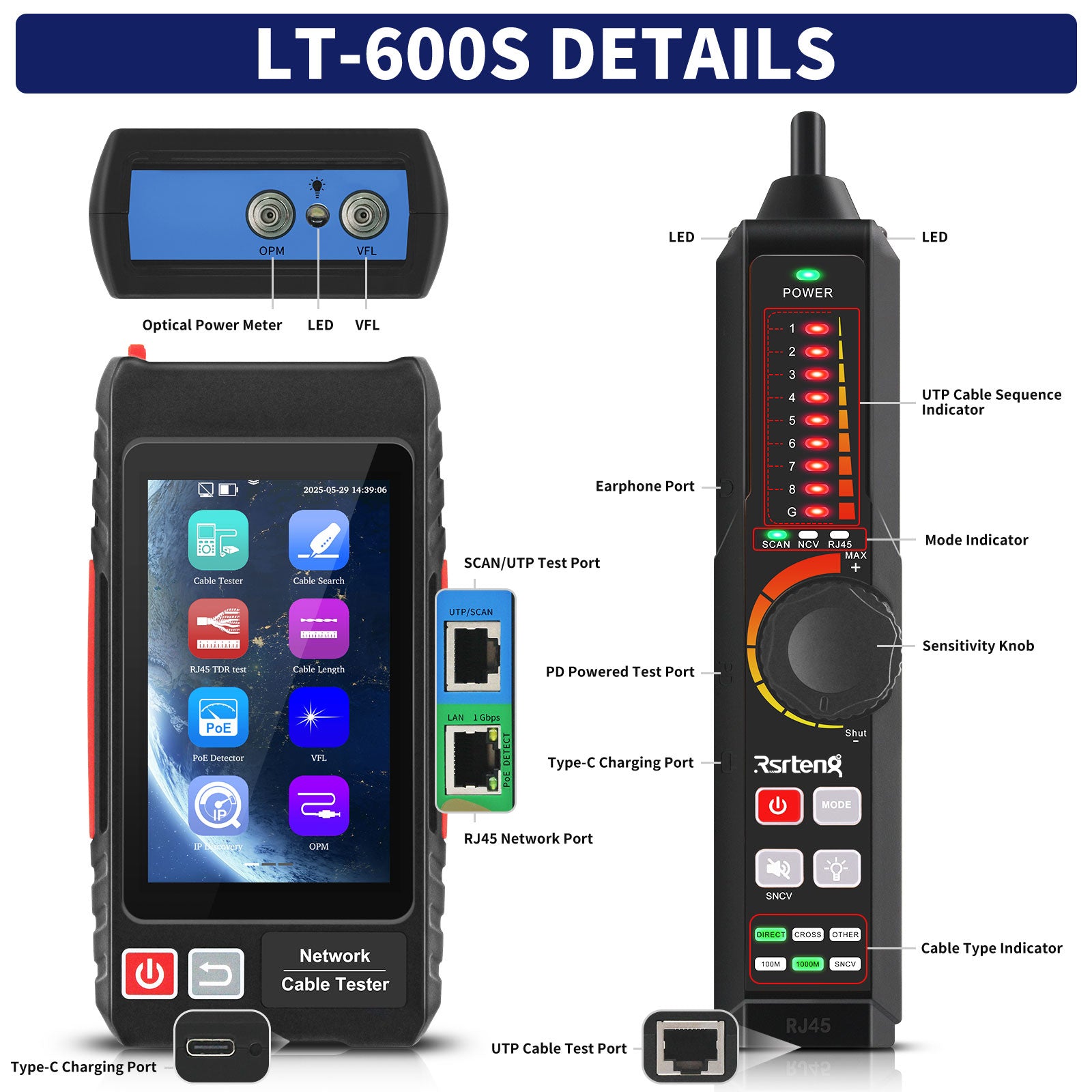 | Cable Types | Supports RJ45 twisted pair, RJ11 telephone cable, BNC video cable, and low-voltage metal cables. |