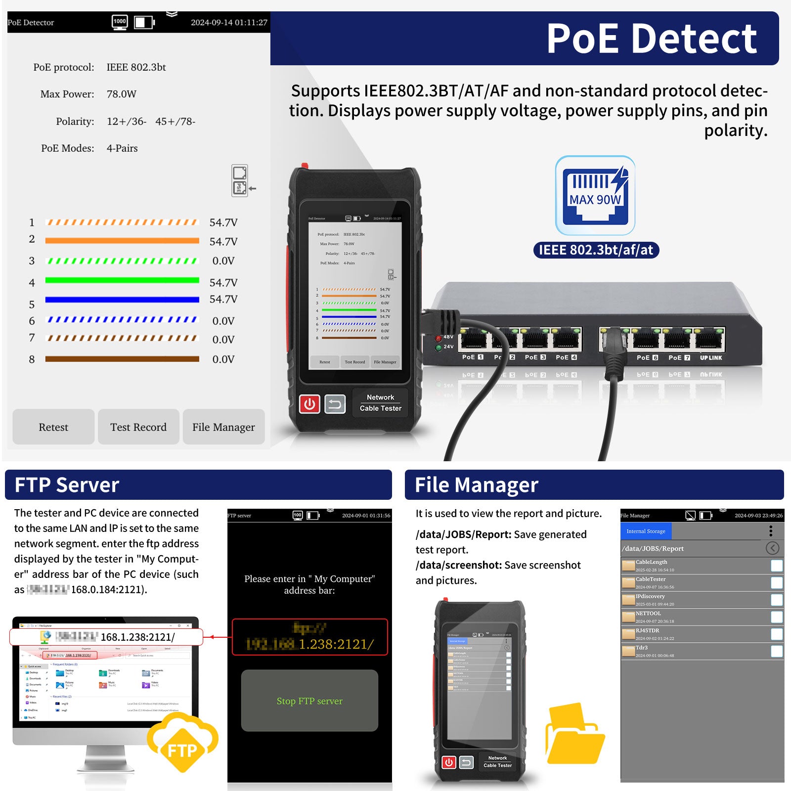 Additionally, it supports PING testing, IP address scanning, Port flash, standard and non-standard PoE equipment detection, PoE power online test.