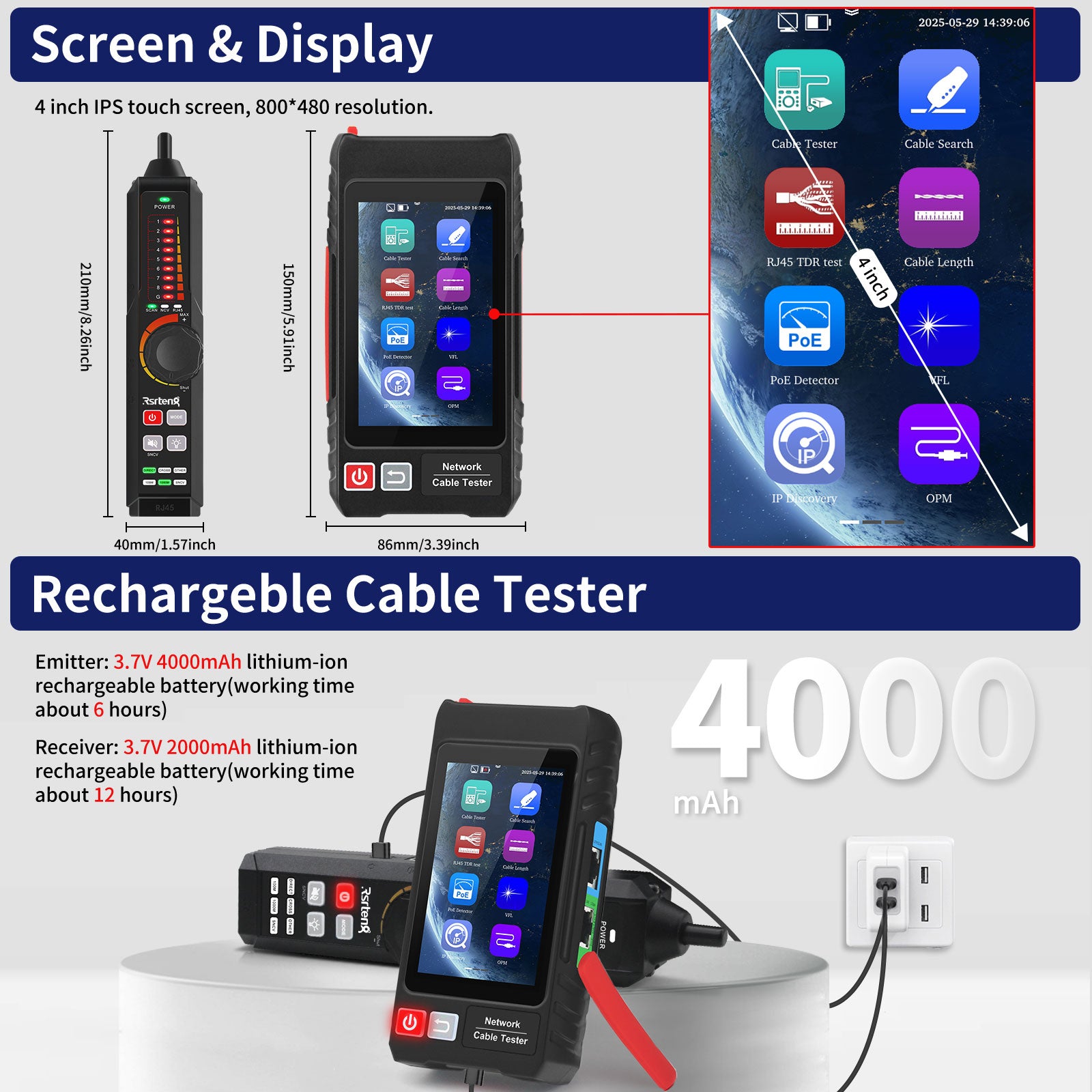 l Main unit and cable tracer. 4-inch color IPS touch screen, 800*480 resolution. Both the main unit and the cable tracer have built-in lithium batteries.